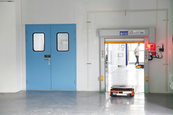 西朗门业快速门能与AGV小车联动,门随车自动、即时启闭