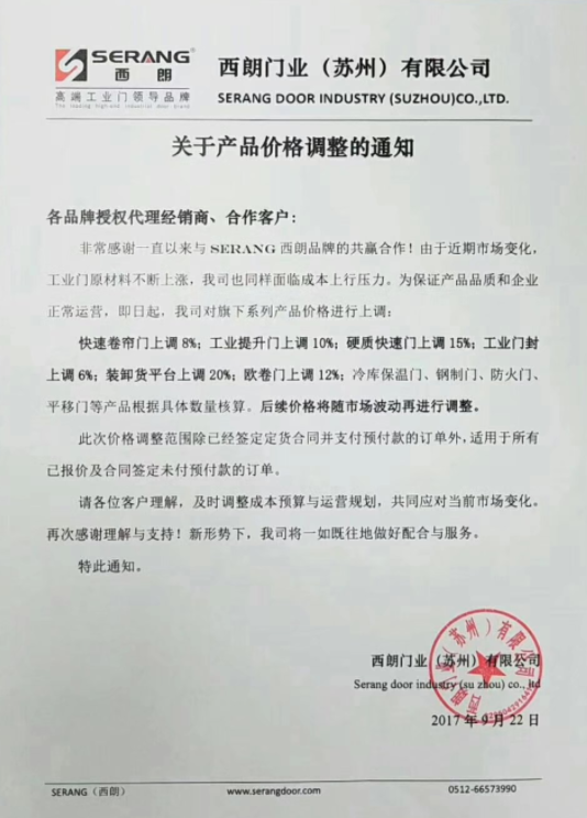 西朗工业提升门、工业快速门价格调整通知