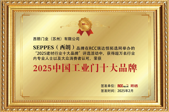 有着十四年行业发展经验的西朗门业(苏州)有限公司旗下品牌 SEPPES(西朗),成功入选 “2025 年工业门十大品牌”,与多家欧美工业门品牌一同登上榜单,彰显出其在工业门行业优良的品牌知名度与影响力,也进一步巩固了自身的品牌实力与发展潜力。