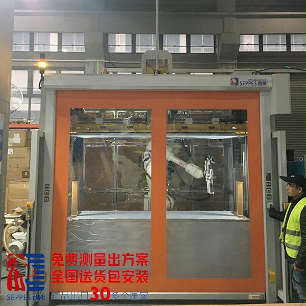 1、此款焊接防护门快速门主要用于自动化机器人焊接车间内,当机器人运作完毕后,快速门自动开启上升,接着由工作人员手动操作手动按钮,使快速门下降,机器人继续开始作业,即完成整套流程。