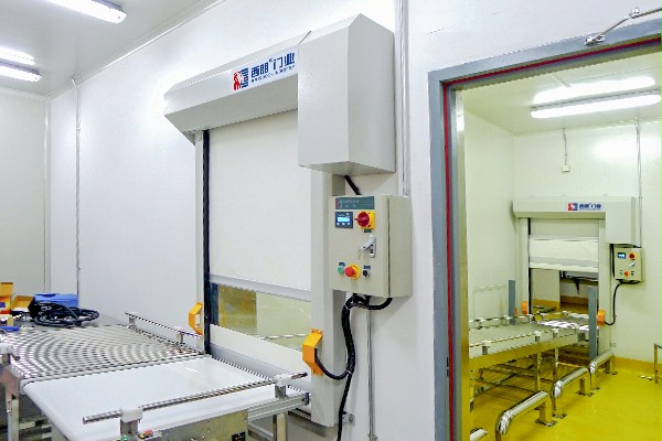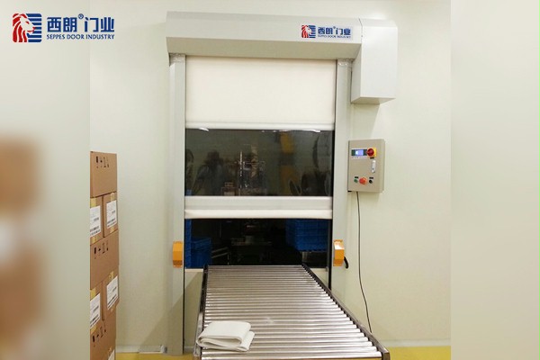 当其中一樘门打开时,另外一樘将处于锁闭状态,从而保证内外环境的隔绝,保证无尘洁净化;当货物在流水线上的时候,流水线联动感应西朗快速卷帘门,流水线给出开门信号,门体可以自动感应开启。